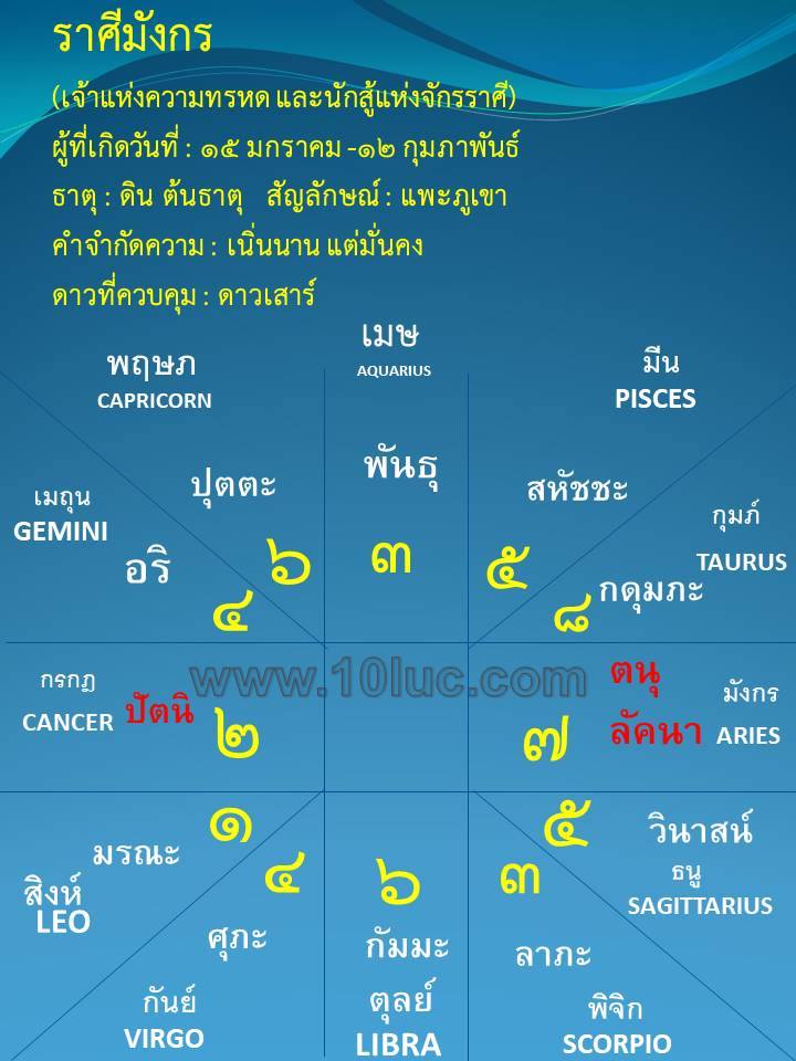 ดูดวง ราศีมังกร ร่างสูงผิดดำแดง คิ้วดกตั้งชันและมีขนที่อก ฟันซี่ใหญ่ บางทีก็ยื่นเขยินออกมานอกปากทำให้งุ่มง่ามน่าลำบาก มีสัญชาตญาณดัดแปลงปรับปรุงตนเองให้เข้ากับเหตุการณ์และสิ่งแวดล้อม ในชีวิตจะได้เลื่อนฐานะขึ้นอย่างใหญ่หลวง ไม่ประหยัดในการแจกจ่ายใช้สรอย ถึงแม้เวลาที่ตกอับอัตคัดขัดสน ถ่อมตัวสุภาพ เผื่อแผ่ อิสสระ เรียบร้อย ทำการงานสำเร็จผล พากเพียรพยายามดี จิตต์ใจเข้มแข็ง ที่จริงเป็นคนกล้าแข็งอดทนต่อชีวิตที่ทุกข์ยากอย่างยิ่ง ใจคอเด็ดเดี่ยว น้ำใจกว้างขวาง กรุณาปราณีต่อคนทั่วไป เอาใจใส่ศึกษาในอักษรศาสตร์ วิทยาศาสตร์ ถ้าเสาร์ให้ผลร้ายจะทำให้เป็นคนช่างอาฆาตพยาบาท ทำให้เป็นคนหูเบา หลับตาเชื่อง่าย ลุ่มหลงมัวเมา ไม่ทำอะไรให้เกิดผล”
